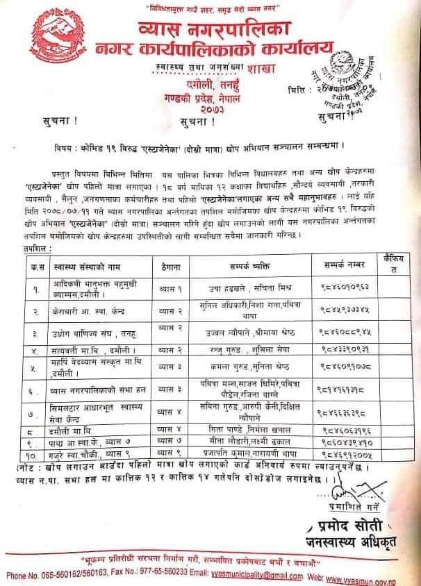 त्यस्तै व्यास नगरपालिकाको सभाहलमा कात्तिक १२ र १४ गते पनि खोप सञ्चालन हुने नगरपालिकाले जनाएको छ ।