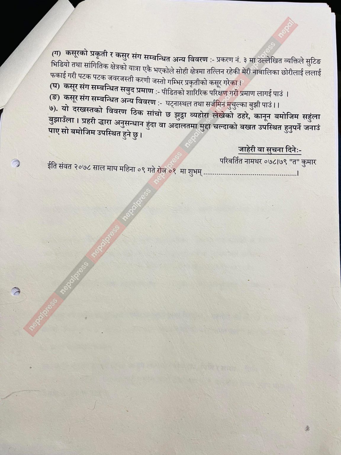 त्यही बेलाकाे जाहेरीलाई सामान्य संसोधन गरेर आज उनले बुझाएकी हुन् । जाहेरीमा उल्लेख भए अनुसार पल र ती गायिकाको पहिलो भेट २०७७ सालमा असोज २२ गते काठमाडौंमा पिपलु वर भन्ने बोलको गीतको भिडियो सुटिङका क्रममा भएको थियो । त्यसपश्चात फेसबुक आइडी र फोन नम्बर आदानप्रदान भयो ।