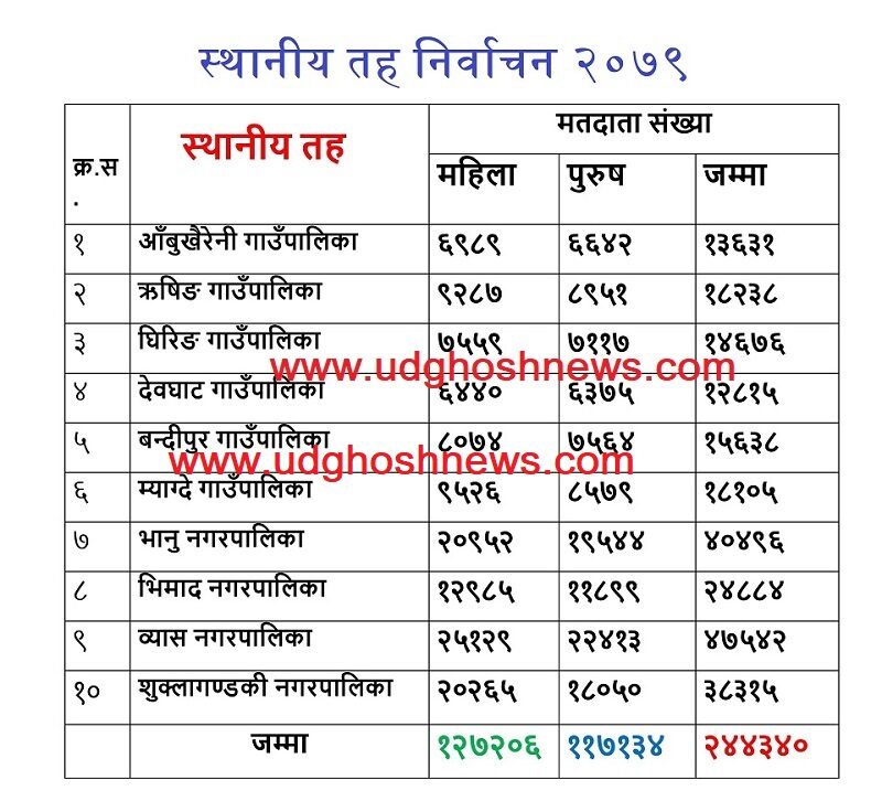 यस्तै व्यास नगरपालिकामा ८ हजार ६२५ जना मतदाता नयाँ थप भएका छन् । व्यास नगरपालिकामा मात्रै ४७ हजार ५४२ जना पुगेका छन् । २०७४ सालको निर्वाचनमा व्यासमा मतदाताको संख्या ३८ हजार ९१७ थियो ।