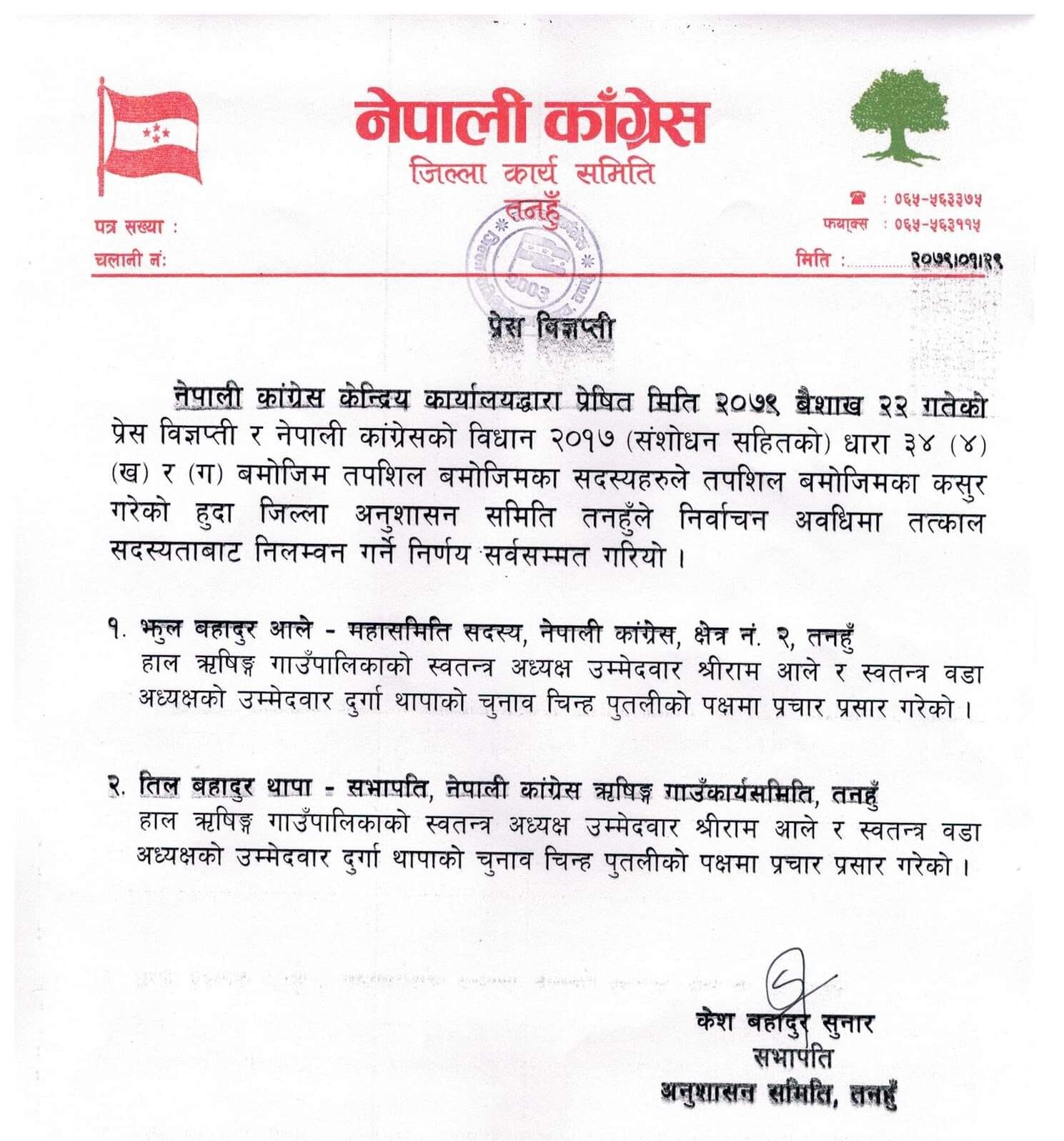 नेपाली कांग्रेस तनहुँले आज एक विज्ञप्ती जारी संविधान सदस्य झुलबहादुर आले र नेपाली कांग्रेस ऋषिङ गाउँपालिका सभापति तिलबहादुर थापालाई निलम्बन गरिएको जनाएको छ ।