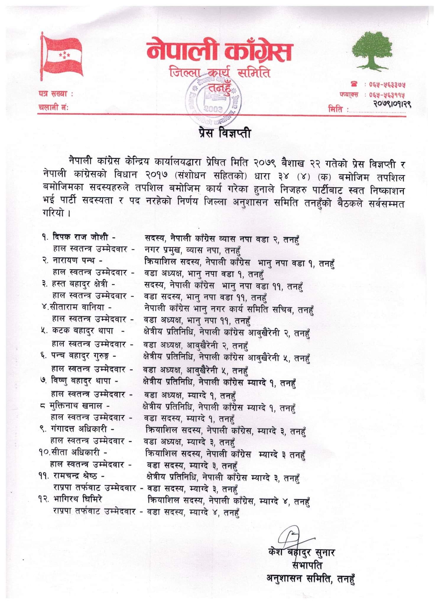 त्यस्तै विज्ञप्तीमा उल्लेख गरिए अनुसार अनुशासन समितिले नेपाली कांग्रेसका कैची चिन्ह लिएर व्यास नगरपालिकाको नगरप्रमुखमा उम्मेदवारी दिएका व्यास २ निवासी दीपकराज जोश, भानु नगरपालिका वडा नं १ का क्रियाशिल सदस्य नारायण पन्थ, भानु नगरपालिका वडा नं ११ सदस्य हस्तबहादुर क्षेत्री, भानु नगर समितिका सचिव सीताराम बानियाँ, म्याग्दे ३ का क्रियाशिल सदस्य गंगादत्त अधिकारी, सीता अधिकारी, क्षेत्रीय प्रतिनिधी रामचन्द्र श्रेष्ठ, म्याग्दे गाउँपालिका वडा नं १ का क्षेत्रीय प्रतिनिधी विष्णुबहादुर थापा, मुक्तिनाथ खनाल ,आँबुखैरेनी गाउँपालिका वडा नं २ का क्षेत्रीय प्रतिनिधी कटकबहादुर थापा , आँबुखैरेनी वडा नं ५ का क्षेत्रीय प्रतिनिधी पञ्चबहादुर गुरुङलाई कार्वाही गरिएको कांग्रेस तनहुँले जनाएको छ ।