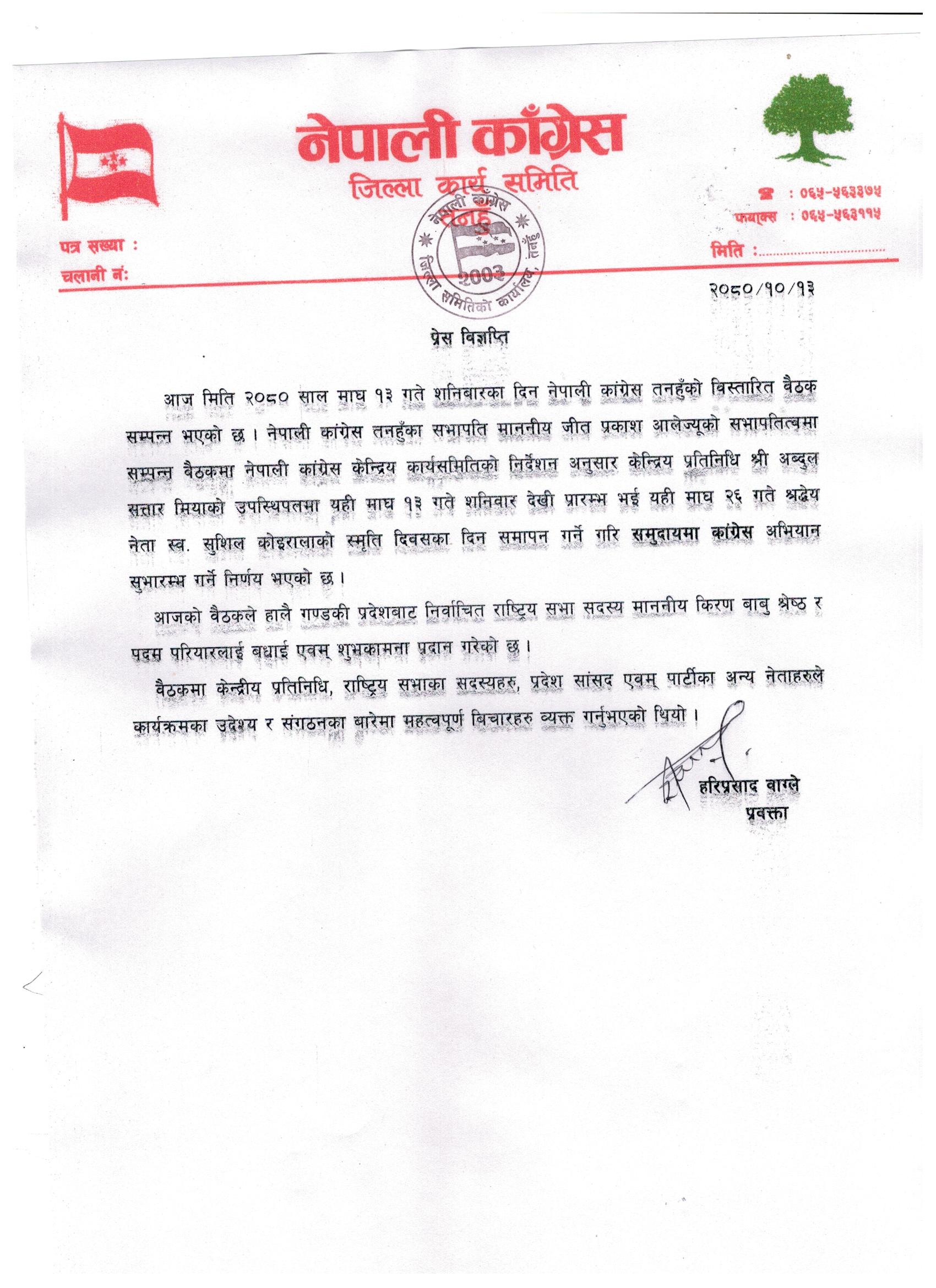 नेपाली कांग्रेस तनहुँका सभापति जीत प्रकाश आलको सभापतित्वमा सम्पन्न वैठकले नेपाली कांग्रेस केन्द्रिय कार्यसमितिको निर्देशन अनुसार केन्द्रिय प्रतिनिधि अब्दुल सत्तार मियाको उपस्थितिमा अभियान संचालन गर्ने निर्णय गरेको काँग्रेस तनहुँका प्रवक्ता हरी वाग्लेले बताए । वाग्लले अभियान माघ २६ गते कांग्रेसका पुर्व सभापति स्व. सुशिल कोइरालाको स्मृति दिवसका दिन समापन गर्ने गरि समुदायमा कांग्रेस अभियान सुभारम्भ गर्ने निर्णय भएको बताए ।