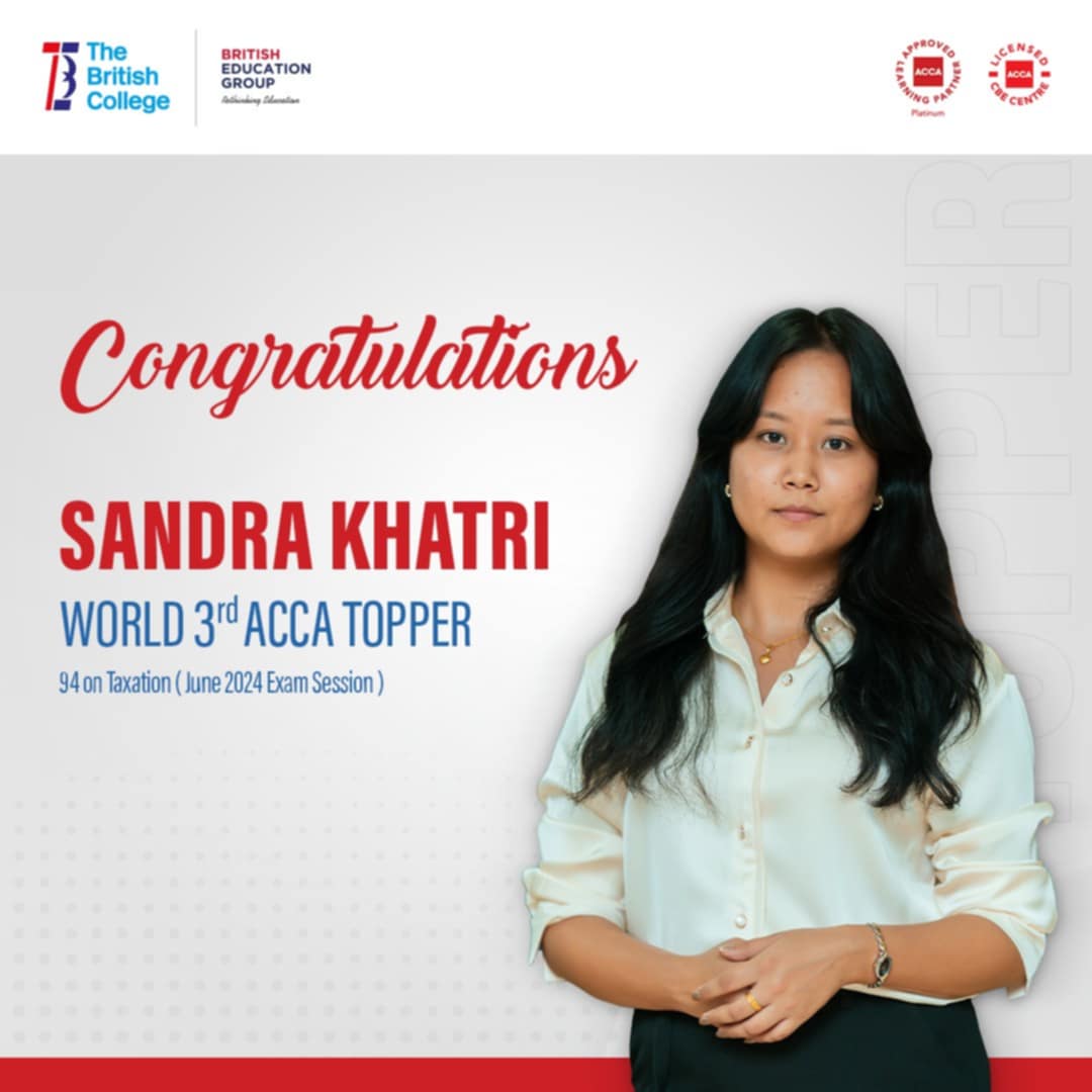 काठमाडौँ । द ब्रिटिस कलेजको एसीसीए शैक्षिक कार्यक्रममा अध्ययनरत विद्यार्थी स्यान्ड्रा खत्री विश्व टपरको दर्जामा पर्न सफल भएकी छिन् । ब्रिटिस एजुकेशन ग्रुप अन्तर्गतको ब्रिटिस कलेजमा अध्ययनरत विद्यार्थी खत्रीले ‘ट्याक्सेसन’ विषयको परीक्षामा विश्वस्तरिय नतिजा ल्याएकी हुन् ।