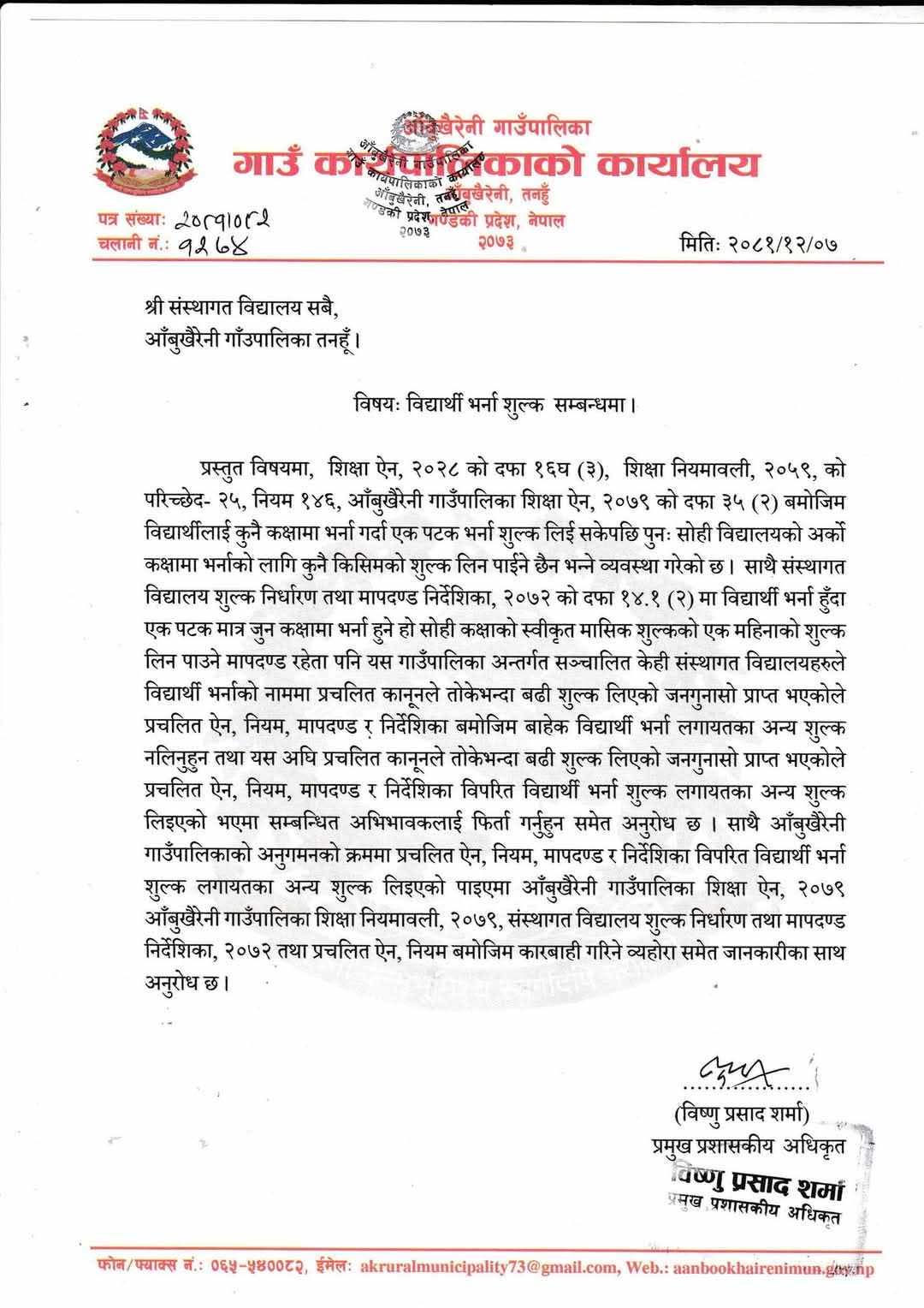 पालिकाका प्रमुख प्रशासकीय अधिकृत विष्णुप्रसाद शर्माद्वारा जरी विज्ञप्तीमा भनिएको छ ‘ आँबुखैरेनी गाउँपालिका शिक्षा ऐन, २०७१ आँबुखैरनी गाउँपालिका शिक्षा नियमावली, २०७९ संस्थागत विद्यालय शुल्क निर्धारण तथा माग निर्देशिका, २०७२ तथा प्रचलित ऐन, नियम बमोजिम कारबाही गरिने समेत सुचनामा उल्लेख गरेको छ ।