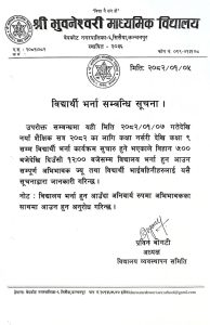 वैशाख ७ गतेदेखि कक्षा नर्सरीदेखि कक्षा ९ सम्म विद्यार्थी भर्ना कार्यक्रम सुचारु हुने बताएका हुन् । विद्यालय भर्ना हुन आउँदा अनिवार्य रूपमा अभिभावकलाई साथमा ल्याउन अनुरोध गरिएको छ ।
